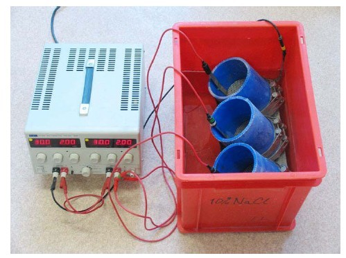 由于氯離子的侵入導(dǎo)致鋼筋混凝土腐蝕,是個(gè)全球問(wèn)題,其結(jié)果是混凝土結(jié)構(gòu)的性能退化。為了評(píng)估混凝土抵抗氯離子侵蝕的能力,唐路平博士在瑞典Chalmers University of Technology 研發(fā)了一種快速測(cè)試方法,這方法叫RCM測(cè)試(RCM – Rapid Chloride Migration).在這個(gè)方法里,使用一個(gè)電場(chǎng)加速氯離子的遷徙過(guò)程,使用了一個(gè)10 to 60 V直流電壓, 根據(jù)混凝土的質(zhì)量,穿過(guò)尺寸為?100 × 50 mm 的試樣,持續(xù)時(shí)間一般是24小時(shí),然后使用一種染色技術(shù)測(cè)量氯離子滲透到混凝土的混凝土的深度。通過(guò)測(cè)量氯離子的侵入深度,擴(kuò)散系數(shù)可以計(jì)算,而這個(gè)系數(shù)可以進(jìn)一步用于混凝土耐久性設(shè)計(jì)中。